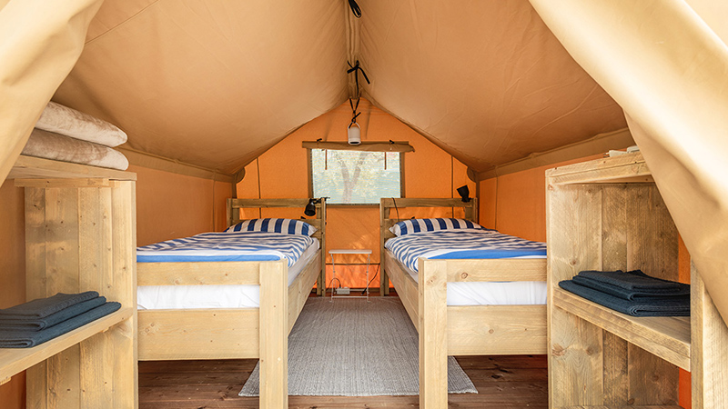 Sip an aperitif on the veranda and rest in a comfortable bed ...you will find the best solution to these needs in a Safari Tent Tiny: functional and relaxed, it consists of a sleeping area for 2 people and an outdoor veranda equipped with table and chairs for the best time on the campsite.